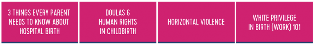 - 4 of Birth Monopoly’s other classes: 3 Things Every Parent Needs to Know About Hospital Birth; Human Rights in Childbirth for Doulas (with Hermine Hayes-Klein); Horizontal Violence and Doula Disempowerment; White Privilege in Birth Work 101 (with Heather Thompson, PhD)